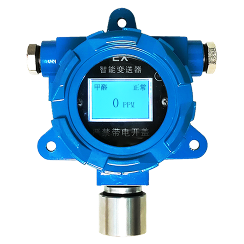 甲醛气体检测探测器,采用铸铝隔爆型壳体,作为防护外壳,同时具有体积小巧重量轻安装方便的特点,该甲醛气体浓度含量检测变送器,以电化学甲醛传感器作为甲醛浓度含量检测元件,将甲醛浓度含量转换为电信号,再由变送板将微弱的电信号经放大器放大后送入微处理器进行信号处理,并转换为标准(4~20)mA电流信号,再输送给需要的上位机设备。该变送器与上位设备的连接仅需要一根两芯的电缆线即可,且连接不区分正负极性,它将信号与电源叠加在一起,既能给设备供电亦能传输信号,大大解决了现场施工布线的难度,使设备调试安装维护更加快捷方便。另外此变送器测量精准、反应迅速、寿命长、稳定可靠、非常适合石油化工、冶金、环境监测等需要对甲醛浓度含量监测的场所。